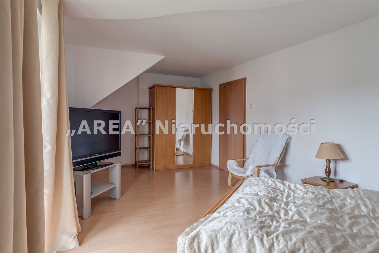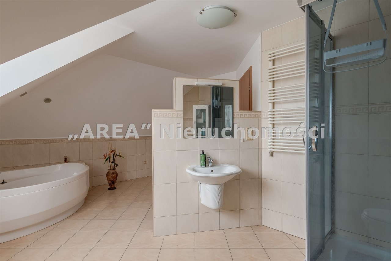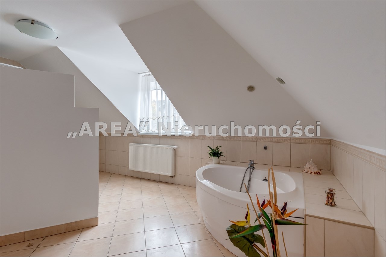 Na piętrze znajdują się trzy sypialni, jedna z wyjściem na balkon oraz duży salon kąpielowy.
