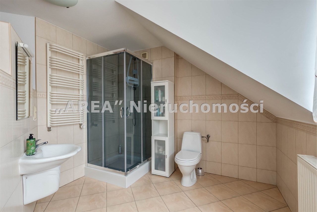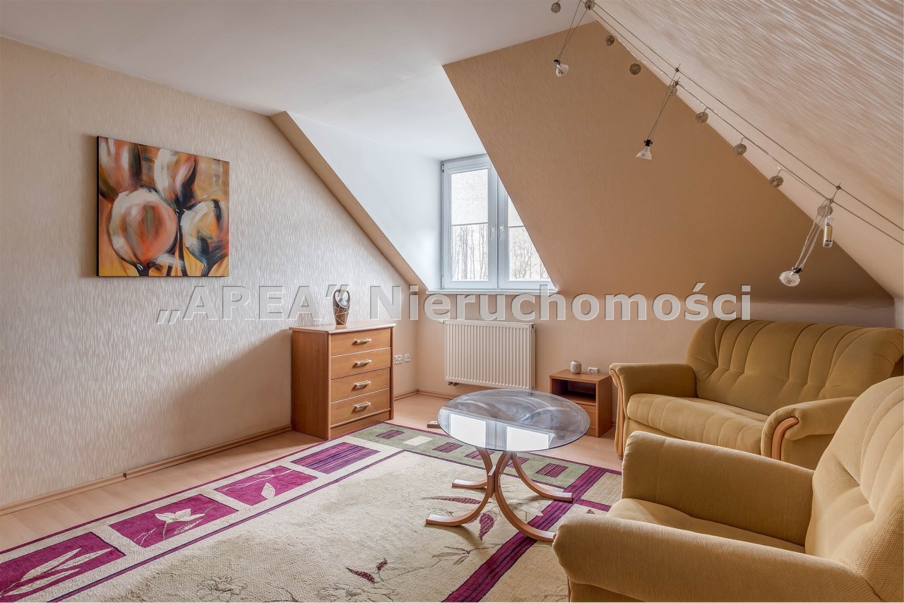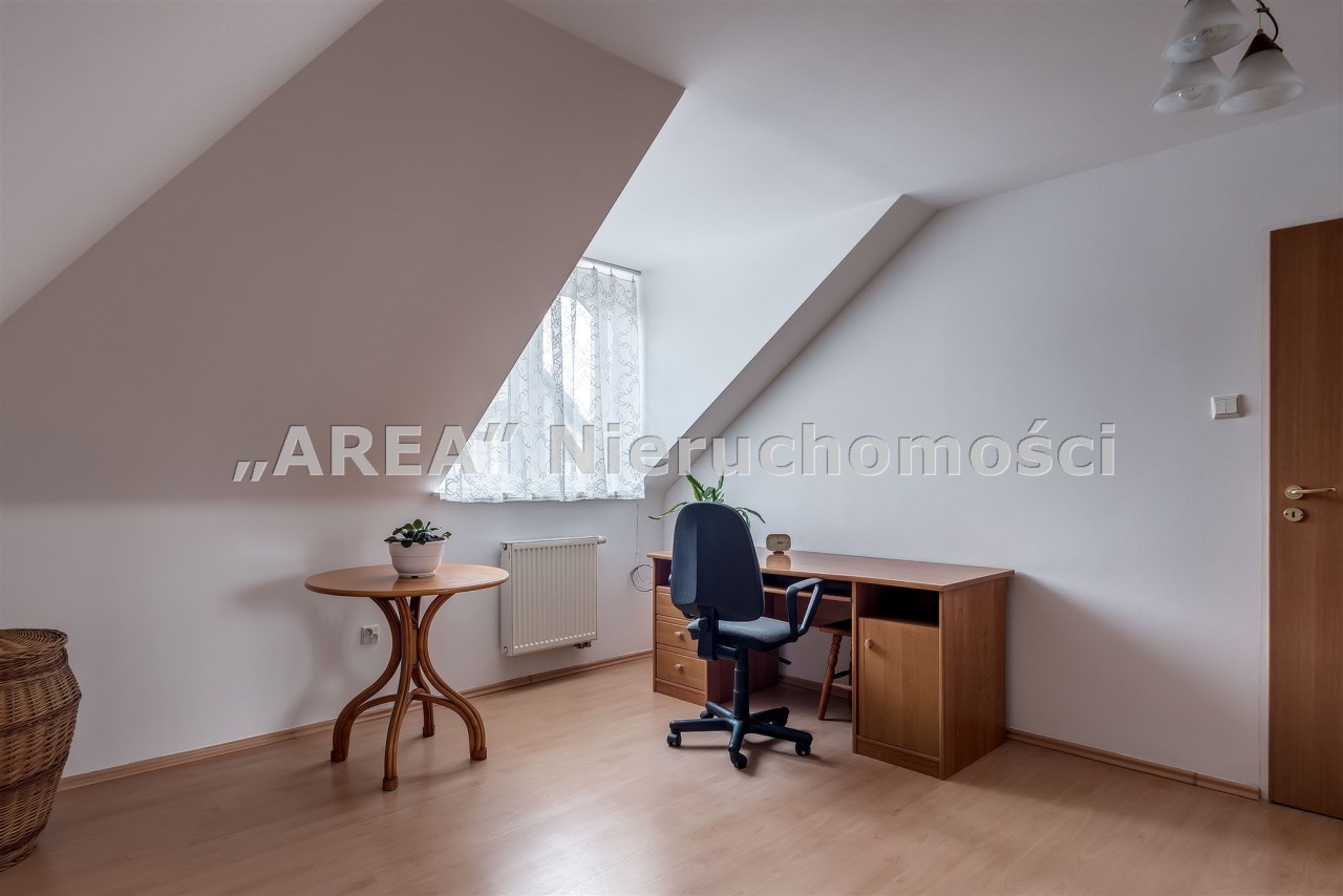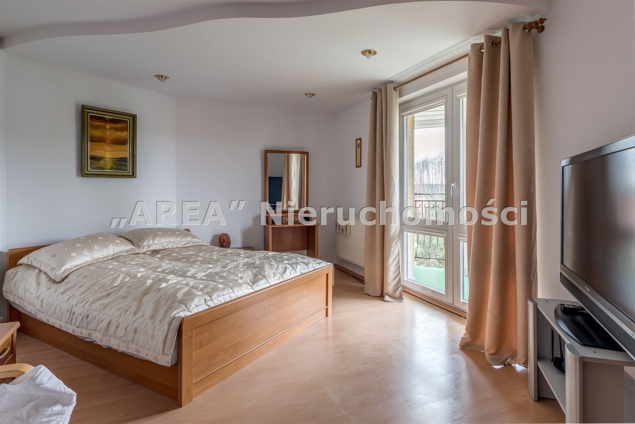 Na piętrze znajdują się trzy sypialni, jedna z wyjściem na balkon oraz duży salon kąpielowy.