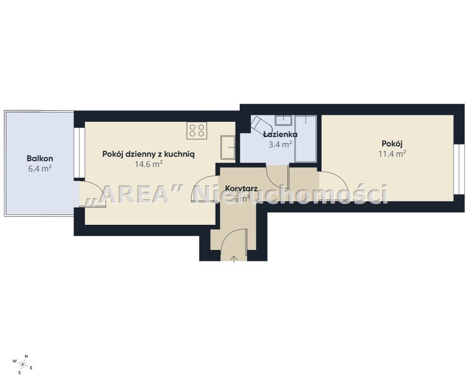 Układ pomieszczeń: strefę dzienną stanowi pokój z aneksem kuchennym (15 m2) oraz wyjściem na loggię (6 m2), sypialnia (11 m2), łazienka z WC (3 m2) oraz korytarz (5 m2).