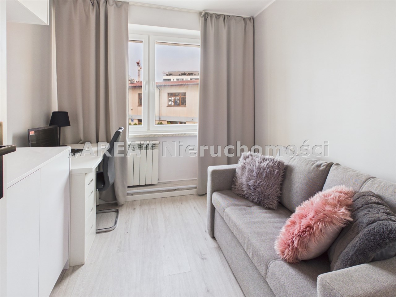 Mieszkanie jest w pełni wykończone i urządzone w nowoczesnym, uniwersalnym stylu opartym na jasnych barwach i odcieniach szarości. Dzięki temu wnętrze jest spójne, estetyczne i gotowe do zamieszkania bez konieczności wprowadzania zmian.