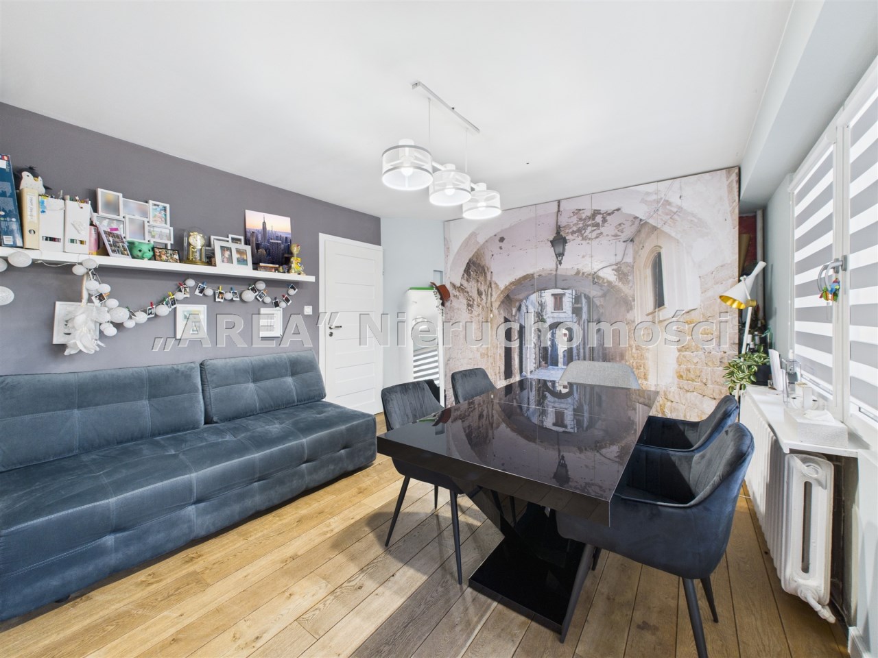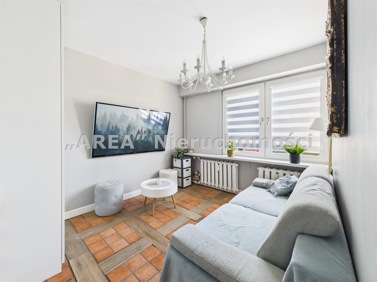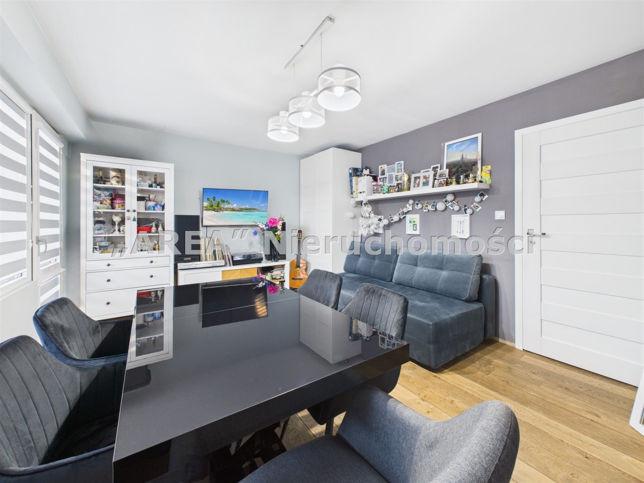 W przestronnym salonie, gdzie podłoga wyłożona jest pięknymi dębowymi deskami, swobodnie mieści się rozkładany stół i wygodna kanapa. Funkcjonalność łączy się tu ze stylem – za fototapetą przedstawiającą urokliwą uliczkę, ukryto pojemną szafę, maksymalizując miejsce do przechowywania. Jedna z sypialni również posiada szafę na całą szerokość pokoju, gwarantując ład i porządek. Druga sypialnia (gościnna) pełni obenie funkcję saloniku telewizyjnego.