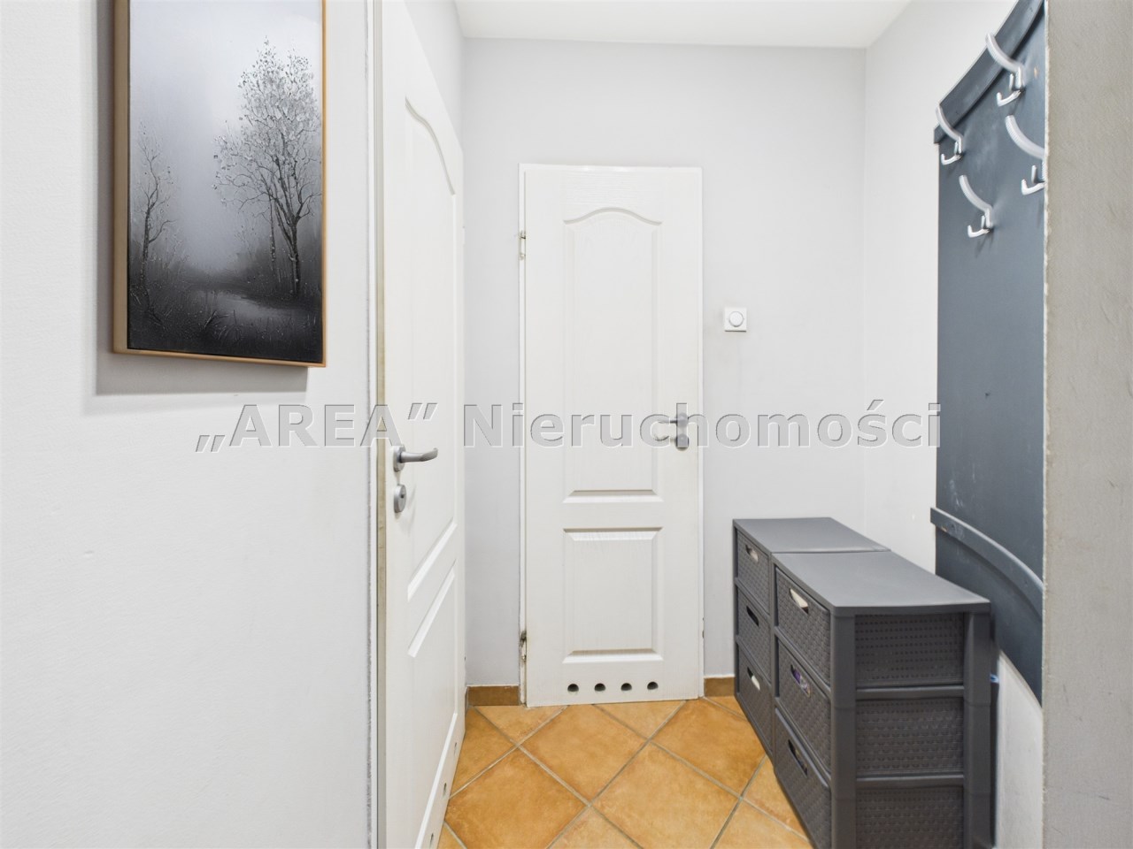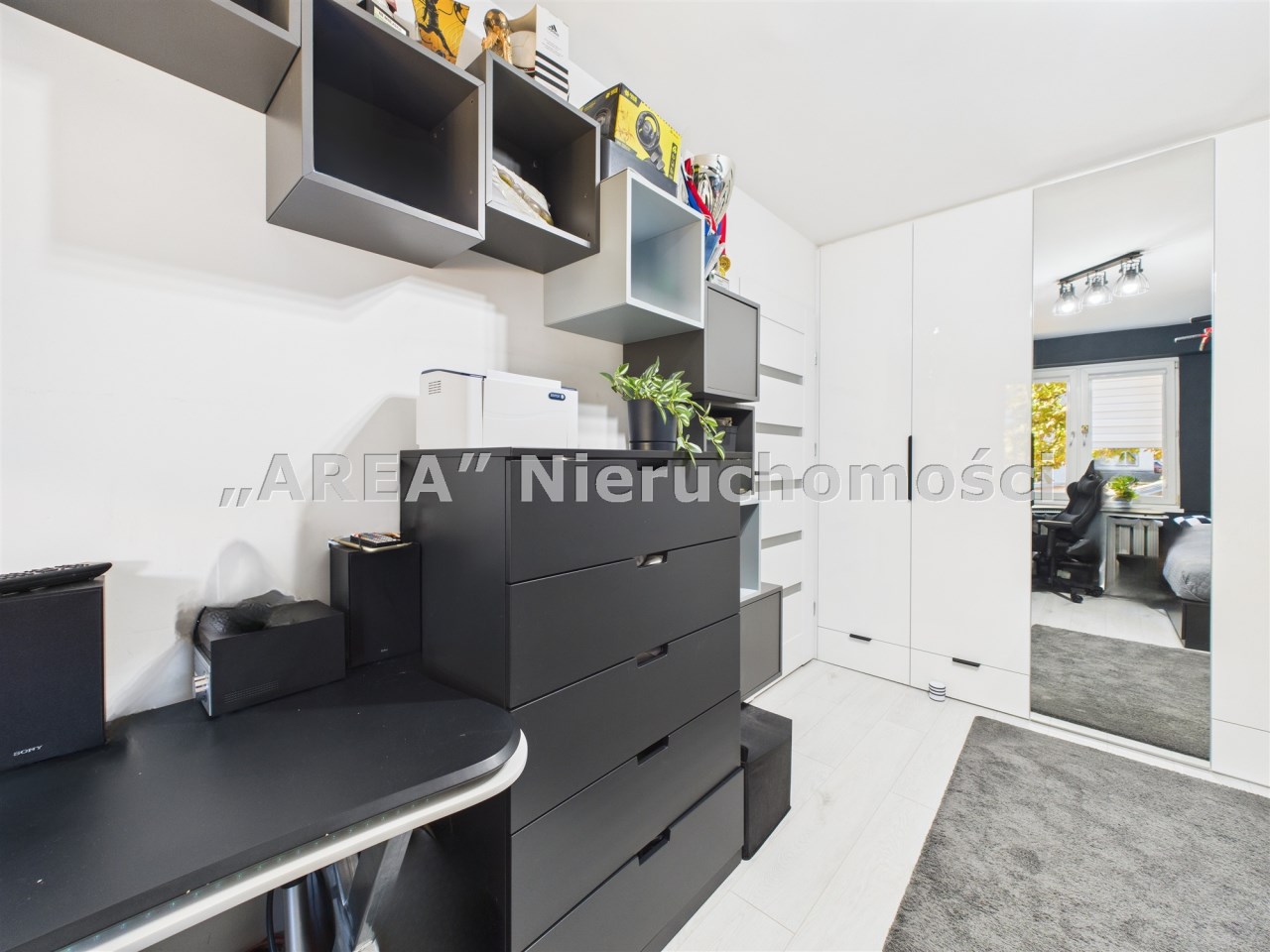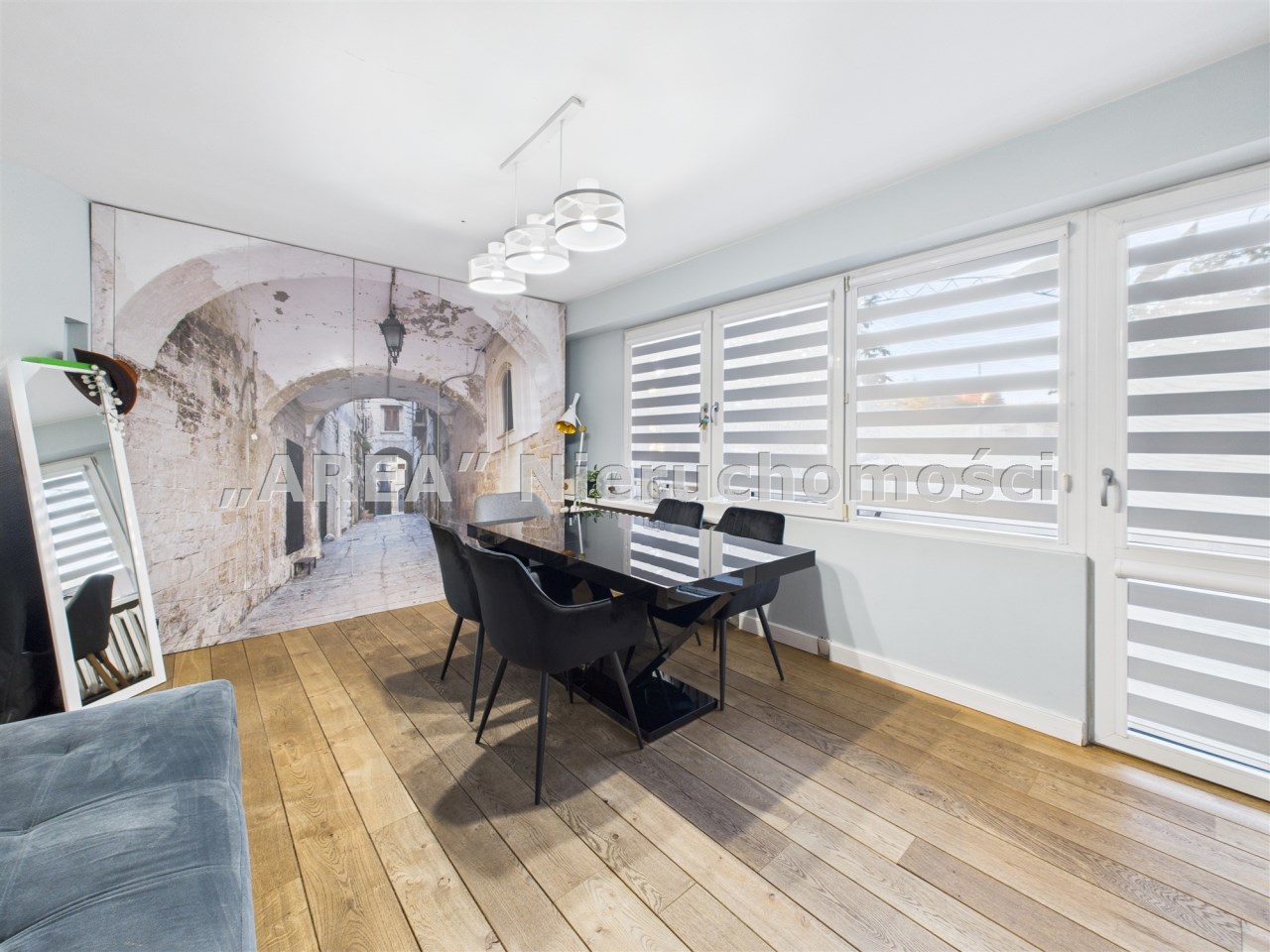 W przestronnym salonie, gdzie podłoga wyłożona jest pięknymi dębowymi deskami, swobodnie mieści się rozkładany stół i wygodna kanapa. Funkcjonalność łączy się tu ze stylem – za fototapetą przedstawiającą urokliwą uliczkę, ukryto pojemną szafę, maksymalizując miejsce do przechowywania. Jedna z sypialni również posiada szafę na całą szerokość pokoju, gwarantując ład i porządek. Druga sypialnia (gościnna) pełni obenie funkcję saloniku telewizyjnego.