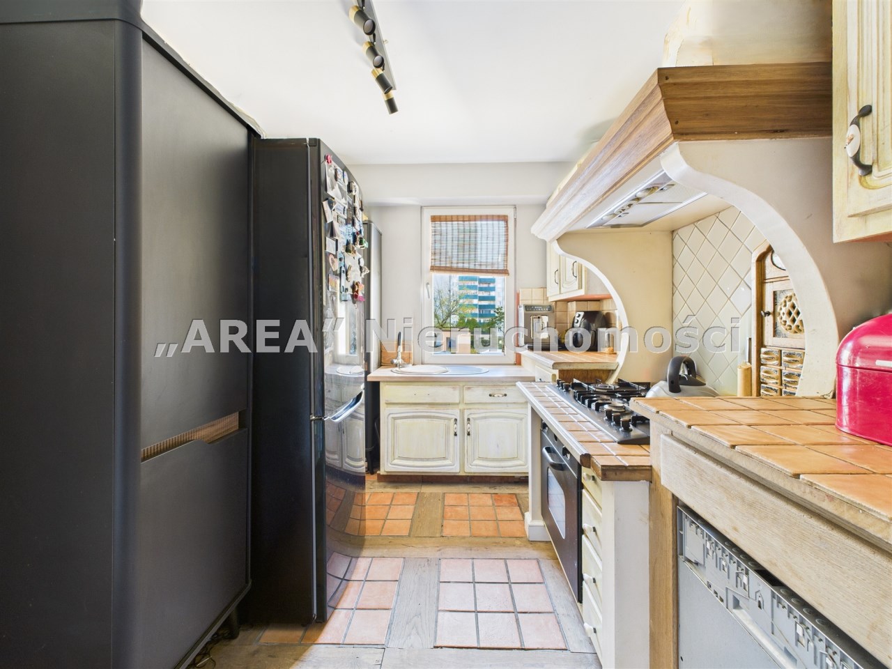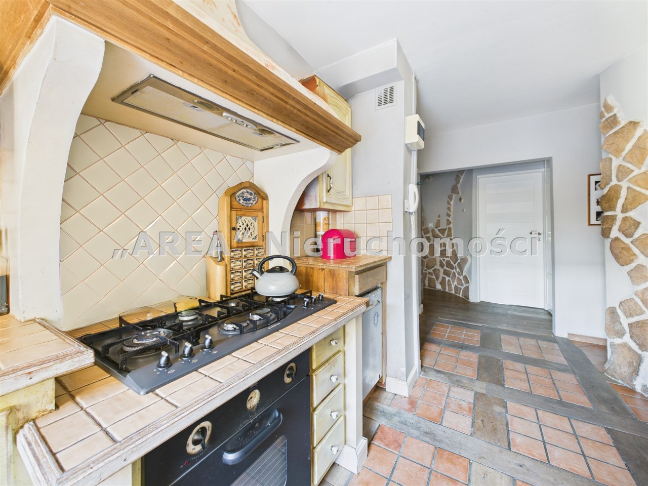 Kuchnia z duszą: To jedyne pomieszczenie bez drzwi, płynnie łączące się z korytarzem. Rustykalna zabudowa z drewnianymi szafkami i blatami z terakoty to kwintesencja domowego ciepła. A duża, 6-palnikowa kuchenka gazowa z obudowanym, retro okapem, dopełnia tę przestrzeń.