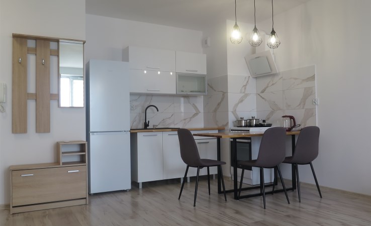 | Wyposażenie kuchni | szafki kuchenne, płyta grzewcza, lodówko-zamrażarka,, kuchenka elektryczna, zmywarka |
